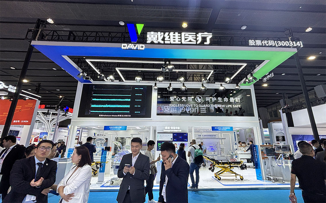 本次展會(huì),戴維醫(yī)療以“數(shù)智賦能,聚勢拓行”為主題,帶來7大產(chǎn)品展區(qū)、5大解決方案等創(chuàng)新成果。展臺(tái)設(shè)計(jì)上采用象征生命與活力的藍(lán)綠色光帶環(huán)繞的形式,與“愛心無限,呵護(hù)生命最初”的理念相呼應(yīng),在一在一眾展位中呈現(xiàn)出新生命般的獨(dú)特視覺體驗(yàn)。